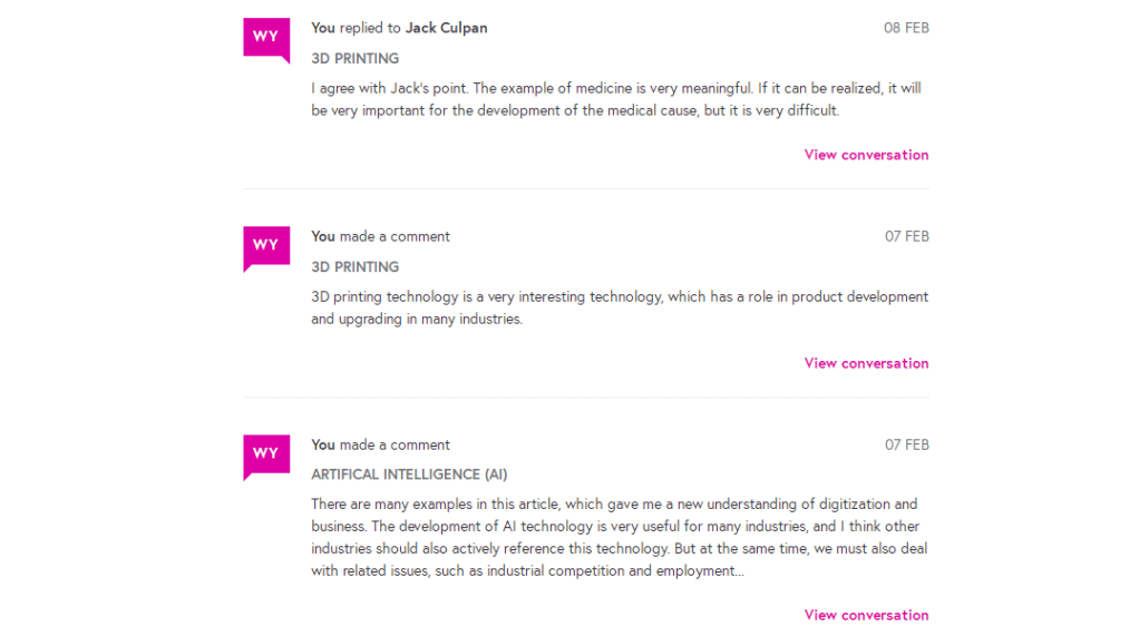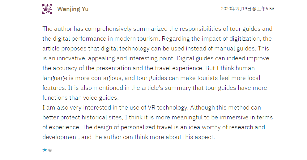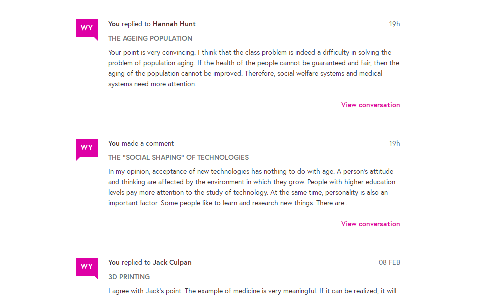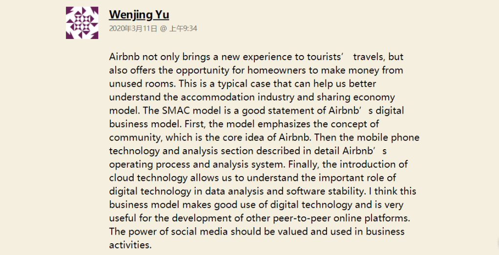 In my previous studies, I always focused on academic resources and teacher feedback. However, the experience in this module made me discover that the communication with my classmates can also bring a lot of new gains. They have amazing ideas and interesting expressions to give me a deeper understanding of the subject. Through comments from others, I can know where there are errors and where can be better. Questioning can keep people awake and make progress.