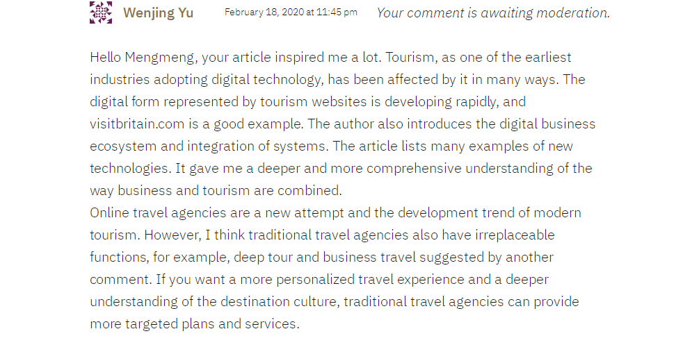 Welcome to my blog. I am Wenjing, and you can also call me Yulanda. I am a student in International Tourism Management at the University of Exeter. This blog is designed to understand the information and skills of digital business models. I hope to apply these skills to tourism management. Personally, my interest in tourism has never been reduced. I studied tourism management for four years as an undergraduate and I still have a passion for this field. I regard traveling as an interesting thing which is full of infinite possibilities and unknowns. Through several years’ learning, I possessed a fundamental understanding and comprehensive knowledge of tourism. My determination to continue my research on this field is firmer. In order to acquire more professional knowledge and practical experience, I came here. After one semester of studying, I learned more about tourism and business. At the same time I think that there are many unknown areas to learn.